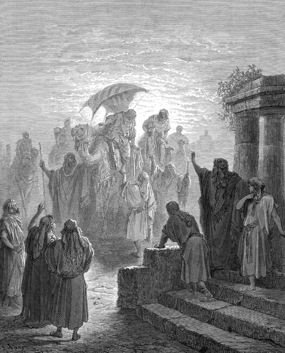 Однажды Исаак вышел в поле и увидел, что вдали движется какой-то караван. Это был Елеазар с Ревеккой. Караван подходил все ближе и ближе. Когда Ревекка издали увидела Исаака, она так растерялась, что упала с верблюда. «Что это за человек идет к нам навстречу?» – спросила она Елеазара. «Это мой господин, Исаак», – ответил Елеазар. Услышав это, Ревекка закрылась своим платком.