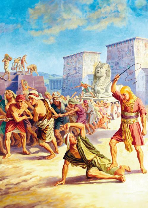 Новый фараон думал: «Если израильтяне будут так размножаться, то они в конце концов взбунтуются и выгонят нас». Вскоре он придумал средство, чтобы израильтяне не размножались. Он стал давать им очень много работы, чтобы замучить их. Израильтяне должны были работать на поле, строить дома и города. Их заставляли делать и обжигать кирпич, тесать и таскать камни для построек. Подумайте, какая это была тяжёлая работа! При них была целая толпа надсмотрщиков, и если кто-то не оканчивал свою работу вовремя, его тут же били палкой.
