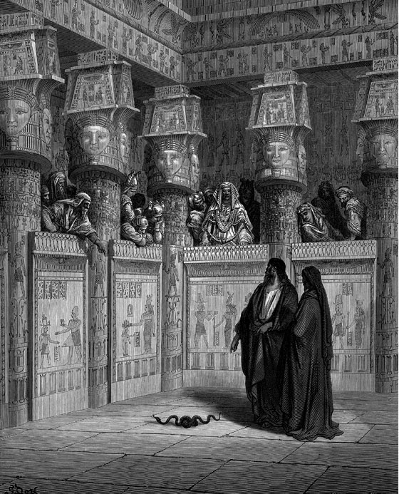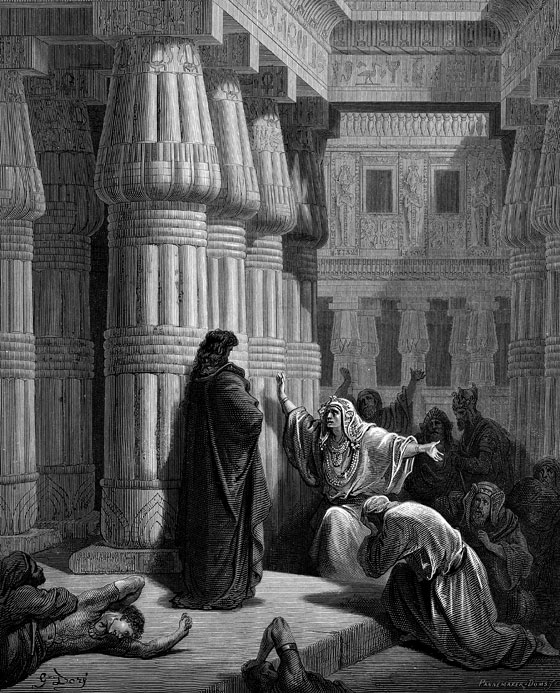Чтобы убедить фараона в том, что Господь действительно послал его, Моисей совершил пред ним чудеса с жезлом и змеей, с рукой и, наконец, с водой и кровью. Но фараон оставался при своем и не отпускал израильтян.