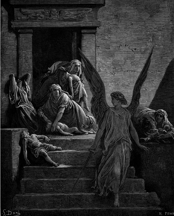 В полночь спустился ангел, посланный Богом убивать египетских первенцев. Он вошел во все дома египтян и в каждом поразил старшего сына – как у царя, так и у последнего нищего. Не осталось ни одного дома, где не было бы мертвеца.