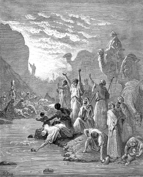 Вскоре после этого израильтяне пришли в такое место, где совсем не было воды. Тотчас же евреи начали роптать на Моисея. «Ты, наверное, затем нас вывел из Египта, чтобы уморить жаждой нас, наших детей и скот. Давай нам пить», – кричали они Моисею с угрозой.