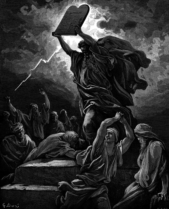 Теперь израильтяне увидели и услышали такие страшные явления, что очень испугались. Над вершиной горы собрались большие черные тучи. Молнии так и пронзали воздух. Гром гремел, и гора сотрясалась так, словно разваливалась. И в этом шуме и треске послышался голос, такой сильный, как будто кто-то трубил в огромную трубу. Это был голос Самого Бога, Который возвестил израильтянам те десять заповедей (правил поведения), что потом были записаны на двух каменных досках.