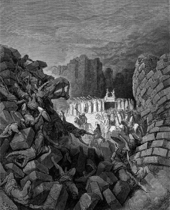 Иисус Навин велел священникам нести ковчег завета вокруг города, а всему народу идти позади. Так они обходили город по одному разу в течение шести дней. На седьмой день евреи встали, как только рассвело, и обошли вокруг города семь раз. В конце седьмого обхода молчаливый до этого народ издал потрясающий вопль, священники затрубили – и крепкие иерихонские стены пали.