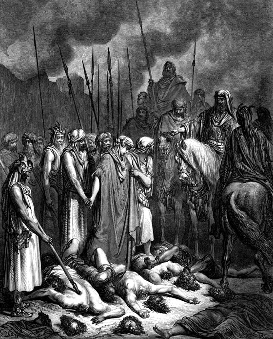 Так, однажды пошел на евреев войной дикий и жестокий народ (мадианитяне). Тяжело было евреям: у них отнимали хлеб, скот, одежду, дома. Трудно было спрятать что-нибудь: враги забирались в дома и шарили во всех углах. Бедных евреев, как рабов, заставляли работать с утра до ночи и ничего им за это не платили. Евреи сделались настоящими нищими.