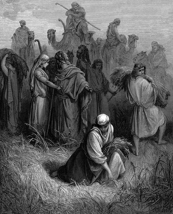 Руфь почитала и любила Ноеминь, как родную мать, и заботилась о ней. Она работала, чтобы прокормить себя и свою старуху. Но обе были так бедны, что у них не было земли, на которой можно было бы посеять хлеб. Когда созревал на полях хлеб и начиналась жатва, бедная Руфь ходила подбирать колосья, которые оставались на чьем-нибудь поле после жатвы.
