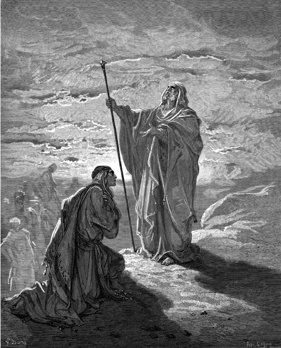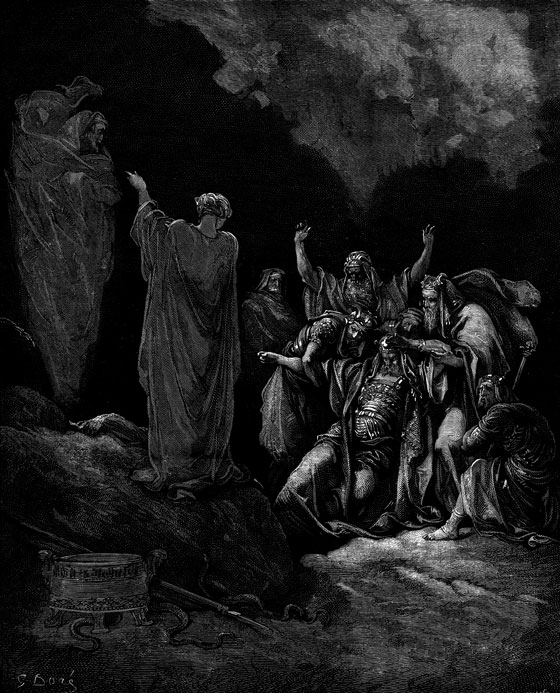 Саул и женщина вошли в темную комнату. Через минуту Саул спросил: «Ты видишь что-нибудь?» «Да! – ответила женщина. – Я вижу духа, выходящего из и». «Какой он на вид?» – быстро спросил Саул. «Он старый и в длинной одежде», – ответила женщина. «Это Самуил!» – вскрикнул Саул, упал на землю и поклонился.