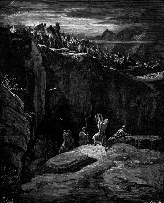 Снова поднялась война между израильтянами и филистимлянами. Вышли войска – израильское и филистимское – и стали друг против друга. Израильтяне находились на горе; напротив, на другой горе, встали филистимляне. Между горами простиралась долина, по которой протекал ручей. Войска долго стояли друг против друга и не начинали сражение.