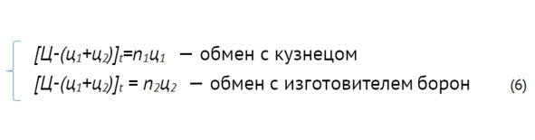 В левой части в одном и другом равенстве – доход пахаря: чистая ценность плуга и бороны в единицу времени, n1 – обмена плугов, n2 – обмена изготовителя борон за то же время.
