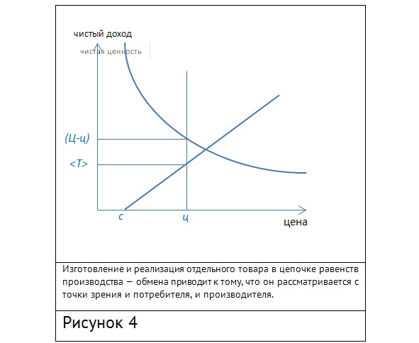 Кстати, только учитывая это условие, можно говорить о том, что цена пропорциональна затратам труда, труда в широком смысле – физического, творческого, интеллектуального. При этом (оптимальная) чистая ценность всех видов товаров, произведенных для данной цепочки обменов за определенный срок, в среднем будет одной и той же.