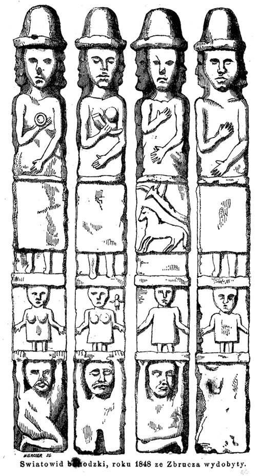 В 1848 году в реке Збруч, притоке Днестра, было обнаружено любопытное изображение: четырехгранный столб, изготовленный из серого известняка, высотой чуть более двух с половиной метров. По высоте он разделен на три яруса, заполненных рельефными изображениями, а венчает его стилизованная человеческая голова, как бы склеенная из четырех лиц, обращенных на четыре стороны света. Эту четырехликую голову покрывает шапка округлой формы.