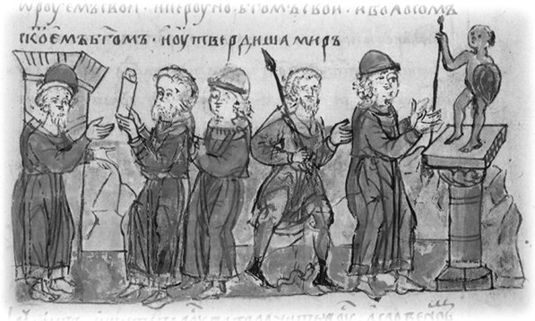 Заключение договора между славянами и греками перед идолом Перуна. Миниатюра из Радзивилловской летописи. XIV в.
