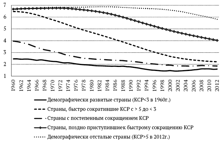 Даже наименее развитые страны уже вступили в первую фазу демографического перехода, это произошло в конце ХХ в. На рис. 1 представлены средние показатели рождаемости по пяти группам из 189 стран за последние 50 лет. К демографически отсталым было отнесено 20 стран, чей коэффициент суммарной рождаемости на 2012 г. все еще превышал пять детей в расчете на одну женщину. Это такие страны, как Афганистан, Конго, Уганда, Нигер и др. В совокупности они составляют 7,9 % мирового населения на сегодняшний день (из них 2,5 % приходится на Нигерию). Снижение рождаемости в этой группе стран только начинается.