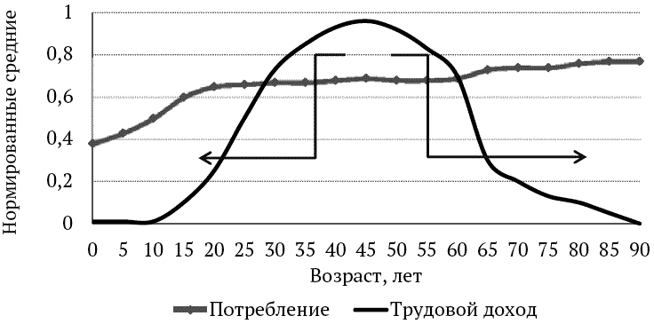 Современное общество предполагает как минимум два периода экономической зависимости в жизни человека – в ее начале и в ее конце. Демографические изменения последних десятилетий приводят в итоге к удлинению обоих. Если в течение детства и старости индивид потребляет больше, чем производит, то в трудоспособном возрасте он производит больше, чем потребляет (рис. 2). Конкретные возрастные профили и точки пересечения кривых потребления и дохода различаются в разных странах (см. более подробно проект NTA: http://www.ntaccounts.org/web/nta/show). Прежде всего они зависят от возрастов входа и выхода с рынка труда, а также от длительности принятых перерывов в трудовой деятельности (в частности, отпусков по уходу за ребенком). То, каким образом восполняется дефицит в младших и старших возрастах, зависит от институциональной среды и от того, трансферты какой формы преобладают в государстве (государственные или частные).