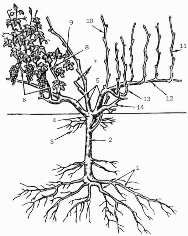 1 – пяточные корни; 2 – подземный штамб; 3 – поверхностные (росяные корни) корни; 4 – голова куста; 5 – рукава; 6 – плодоносные побеги; 7 – плодовое звено; 8 – бесплодный побег; 9 – пасынок; 10 – порослевый побег; 11 – однолетние побеги (лозы); 12 – стрелка плодоношения; 13 – сучок замещения; 14 – рожок