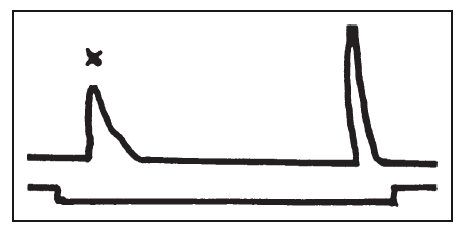На ленте кимографа (вся регистрирующая часть установки дана на рисунке 4) мы получали, таким образом, запись, одновременно отражавшую три важных для наших опытов линии (мы приводим типичный отрезок на рисунке 5):