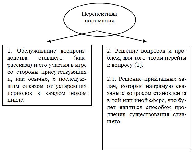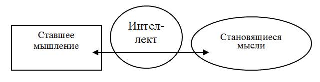 Смешанное мышление (Схема 40) может включать и первый, и второй формат рассказывания в зависимости от запросов, времени, места, этапа, а также специфики развития интеллекта в тот или иной период своего существования, то есть те вопросы, которые становятся постоянными, и та отрасль, которая становится основной – это ставшее содержание. А те акты, которые возникают периодически или в связи с новизной мысли или другими обстоятельствами, определяются через становящуюся активность.