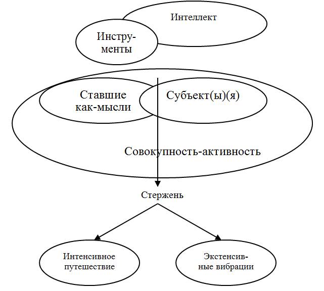 Интеллект в контексте нарисованного конструкта (Схема 44) может двигаться в любую сторону и выполнять любые действия, но только в границах схемы. Изучать среду, изучать любую активность, ее содержание, стержень. Рассматривать вопросы, связанные с типами развития, и предлагать варианты технических рассказов. Такой инструмент может быть каким угодно, с точки зрения содержания и т. д., важно только выполнение двух основных функций, остальное несущественно и должно служить только этому.