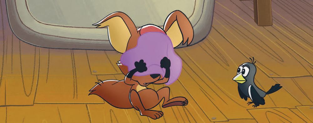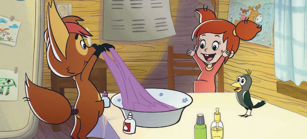 Младшая сестрёнка Дяди Фёдора Вера Павловна устроилась за столом и вместе с Тамой-Тамой слайм делает. Тама-Тама в миску налила клей и накапала туда жидкости из разных пузырьков. Масса в миске загустела, и зверушка стала её лапками месить, как тесто.