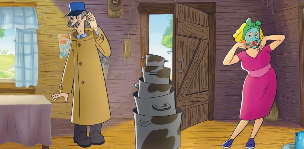 В дом зашёл почтальон Печкин, держа в руках высоченную башню из грязных кастрюль.