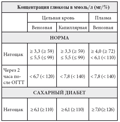 Интересно, что показатели гликемии, при которых диагностируют сахарный диабет, варьируют в зависимости от метода исследования и используемого материала (цельная капиллярная или венозная кровь, или же венозная плазма) – см. таблицу 1.