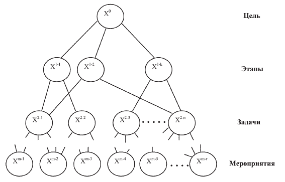 III. Разработка структуры системы. После определения цели для последующего проектирования системы использовался метод построения ДВ. Данный метод основан на дезагрегировании исследуемой генеральной цели на составные элементы с последующей оценкой их относительной важности и увязкой с ресурсами, исполнителями и временем реализации каждого элемента. Дерево взаимосвязей – это графический рисунок, вершины которого интерпретируются как элементы дерева, а ребра – как связи между ними (цели, задачи, мероприятия, ресурсы и т. д.) (рис. 1).