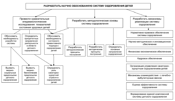 Для проектирования методологии системы оздоровления детей был использован метод программно-целевого планирования, в основе которого лежит методика с парадигмой: цель – результат – программа. Основа программно-целевого планирования – управление от целей системы с определением четких критериев оценки промежуточных и конечных результатов. Проект разрабатывался поэтапно и процесс разработки начинался с выявления проблемы на основе системного анализа, доказательной оценки ее приоритетности, разработки системы прогнозов и генеральной цели. Далее проводилась ее декомпозиция, формировалось «дерево целей». Затем разрабатывались мероприятия по реализации и контролю за выполнением проектных мероприятий.