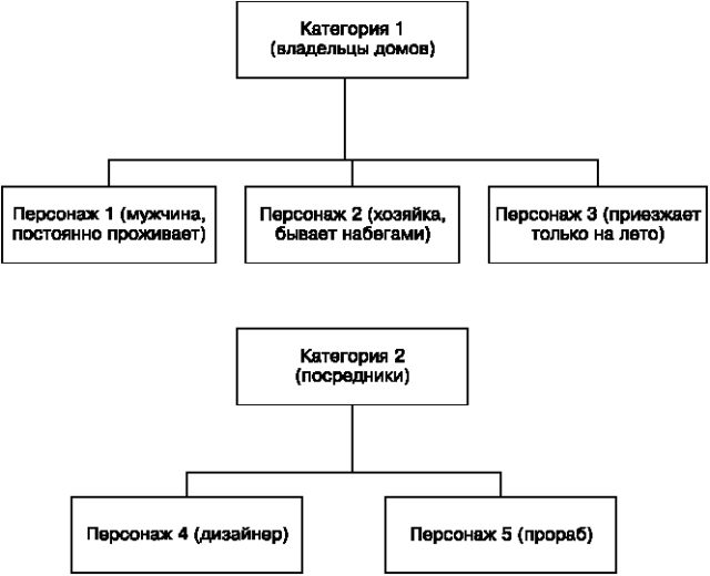 Но вернемся к карте персонажей. Теперь, чтобы еще полнее проработать свою целевую аудиторию, необходимо разделить ее на более узкие категории. Рассмотрим, как это сделать, еще на одном примере – персонажах для товара «камины для дачи» (рис. 1.5).