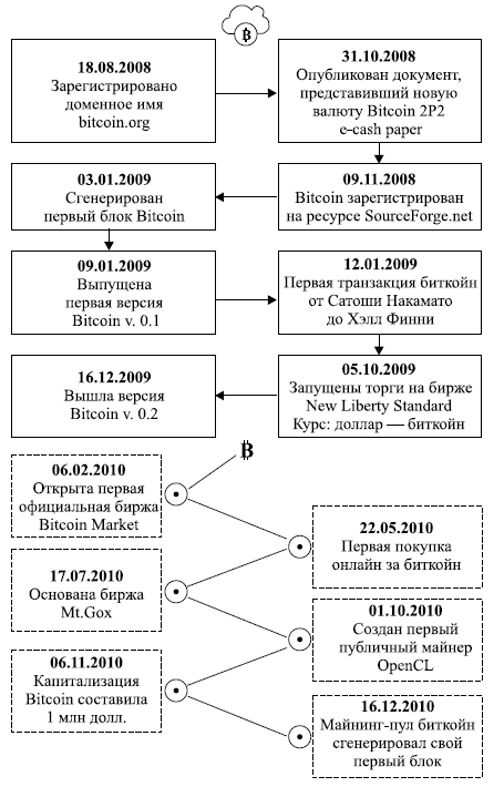 Протокол Bitcoin был разработан в 2008 г. и описан в статье Сатоши Накамото – автора, идентичность которого не установлена и по сей день. Кроме того, в статье был впервые подробно рассмотрен механизм регистрации транзакций в блокчейне, что позволило запустить расчетную систему Bitcoin и обеспечить возможность мгновенных транзакций в любой точке земного шара. В 2009 г. разработчиками протокола зарегистрирован первый блок протокола Bitcoin, или блок генезиса. Первые 50 биткойнов были выпущены в оборот. В этом же году был опубликован первый курс биткойнов на бирже по отношению к доллару. Тогда за 1 долл. США можно было получить 1309 биткойнов[47].