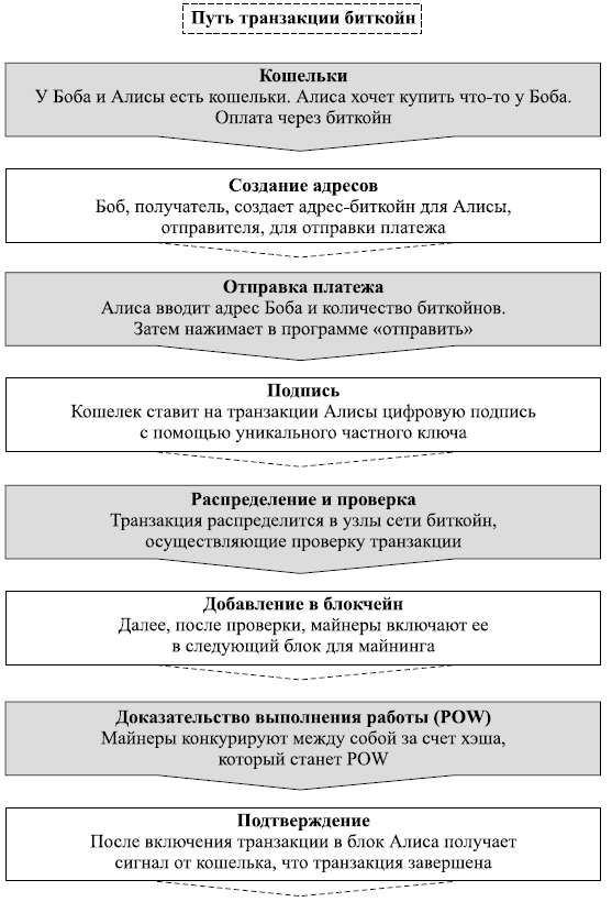 Информация о количестве единиц виртуальной валюты у пользователя хранится в биткойн-кошельке. Кошелек представляет собой текстовый файл, содержимое которого закодировано посредством пары ключей: частного и публичного[58]. Частный ключ хранится на руках у владельца биткойн-кошелька и используется для подтверждения воли на совершение платежа. Публичный ключ применяется для идентификации кошелька получателя. По факту публичный ключ является «адресом», тогда как частный ключ представляет собой «почтовую марку». Без частного ключа перевод невозможен. Отправитель и адресат подтверждают действительность сделки совместно, представляя пару ключей. Соответственно, действительность транзакции подтверждается на нескольких уровнях: 1) при сопоставлении ключей контрагентов по сделке; 2) при подтверждении транзакции другими пользователями блокчейна и размещении информации о платеже в новых блоках. Кроме того, полная копия цепочки данных, т. е. блокчейна, сохраняется на компьютере каждого пользователя, что сокращает вероятность утраты данных.