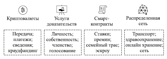 Прикладные направления применения блокчейна можно расположить, следуя от наиболее очевидной (платежной) функции к комплексной функции по регистрации сделок с использованием децентрализованной подписи:
