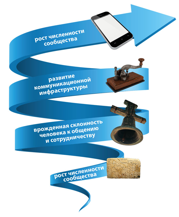 По сути, рост численности сообщества и развитие коммуникационной инфраструктуры взаимно толкают друг друга: чем более эффективными средствами общения и координации действий обладает сообщества, тем большую эффективную численность оно может поддерживать. В то же время для обеспечения воспроизводства самой инфраструктуры и всех развивающихся на ней хозяйственных и прочих культурных практик нужно значительное количество людей. А чем больше становится людей, тем более эффективные средства общения и координации действий им требуются.