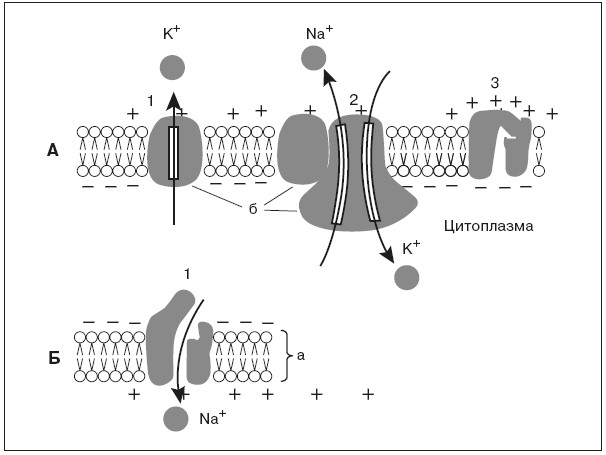 А – каналы «утечки калия» (1), «натрий-калиевый насос» (2) и закрытый в покое натриевый канал (3); Б – открытый при возбуждении натриевый канал (1), вхождение ионов натрия в клетку и смена зарядов на наружной и внутренней стороне мембраны