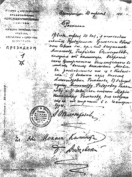 Из телеграммы главе большевистского правительства из Екатеринбурга, 4 июля 1918 года.В Екатеринбурге царь и сопровождающие его люди были переданы председателю Исполнительного комитета Совета Рабочих и Крестьян Уральской области под расписку, в которой были перечислены: