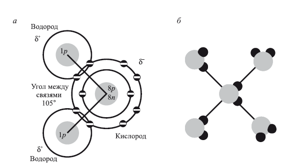 Рис. 1. Молекулярная структура воды (по П. Кемпу и К. Армсу, 1980): а — молекула воды: один атом кислорода ковалентно связан с двумя молекулами водорода; б — водородные связи между молекулами воды: светлые кружки – атомы кислорода, темные кружки – атомы водорода