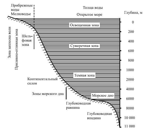 Рис. 2. Примерная схема вертикальной и горизонтальной зональности моря (по X. Хилю, 1988)