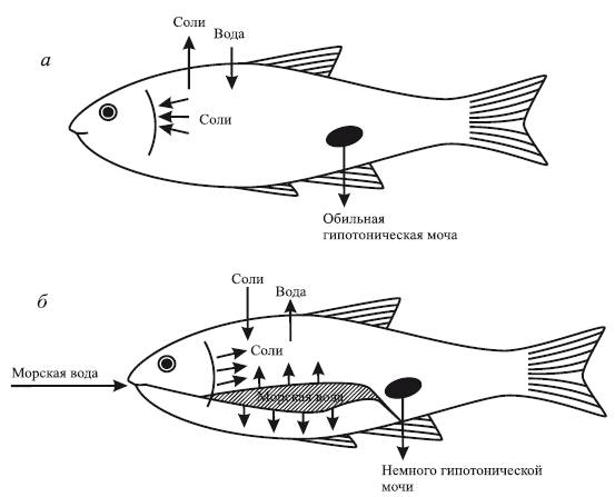 Рис. 3. Осморегуляция у пресноводных (а) и морских (б) костистых рыб (из Ю. Одума, 1975)