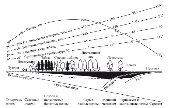 Характер распределения солнечной энергии по широте и высоте, а также неравномерность увлажнения (на суше) определяют явление географической зональности и вертикальной поясности. Годовая температура понижается при движении с юга на север на каждые 100 км (или 1° широты) на 0,5 °C, а с поднятием в горы – на 0,6 °C на каждые 100 м. Зональный характер носят основные природные процессы: климатические, гидрологические, геохимические, эдафические, геоморфологические, биогеографические и др. Закономерности и количественные характеристики природных процессов по профилю через основные природные зоны Восточной Европы отражает схема (рис. 4).