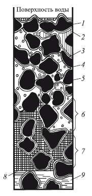 1 — частицы почвы; 2 — гравитационная вода; 3, 5 – гигроскопическая вода; 4—почвенный воздух с парами воды; 6 — зона открытой капиллярной воды; 7 – зона замкнутой капиллярной воды; 8 — уровень грунтовой воды; 9 — грунтовая вода