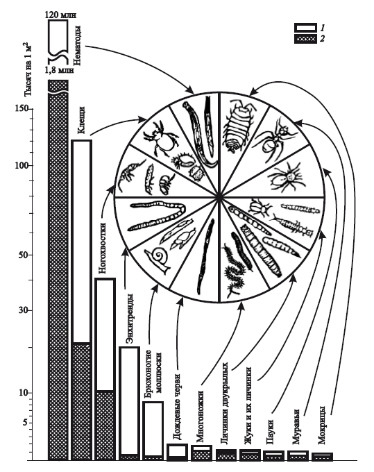 Рис. 7. Плотность населения луговой почвы (на 1 м2) до глубины около 30 см (по А. Брауну, 1988):1 — максимум; 2 — минимум
