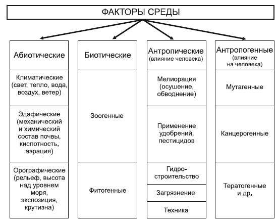 Факторы среды – это элементы среды, оказывающие специфическое действие на организм. Влияние факторов весьма многообразно. Они выступают как раздражители, ограничители, модификаторы или имеют сигнальное значение. По своей природе факторы среды являются абиотическими, биотическими и антропическими. Особую группу составляют факторы антропогенные, действующие на человека (рис. 8).
