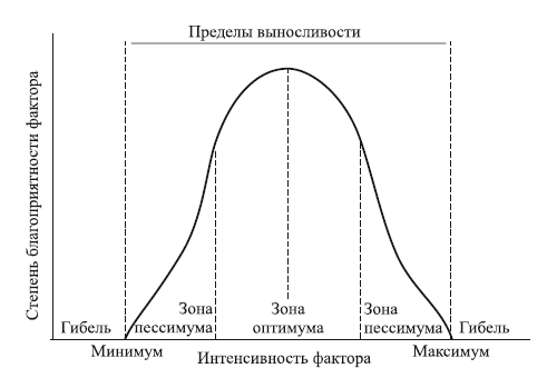 В. Шелфорд, изучая жуков-скакунов, установил, что жизнь этих насекомых протекает в очень точных пределах факторов среды. Кладка яиц производится под камни, где мало света, в песчаную, рыхлую, хорошо дренируемую, с небольшим содержанием гумуса почву при очень узком интервале температур. Только в таких условиях выживают личинки. Эти и другие «точности» в жизни животных привели Шелфорда к понятию «пределы выносливости», а затем к формулировке закона толерантности. Закон гласит, что лимитирующим фактором процветания организма (вида) может быть как минимум, так и максимум экологического воздействия, диапазон между которыми определяет величину выносливости (толерантность) организма к данному фактору. Схематически содержание закона отражает рис. 9. Возрастание напряженности фактора, начиная с предельно малого значения, вызывает сначала повышение эффекта, а затем резкое понижение и гибель. В соответствии с этим в пределах диапазона выносливости имеются зоны: оптимума, или комфорта, где вид процветает; пессимума, или минимума, в которой вид более редок, жизненность особей пониженная. За пределами выносливости, фиксируемыми минимальной и максимальной кардинальными (критическими) точками, особи вида погибают.