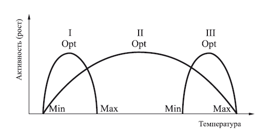 Рис. 10. Относительные пределы толерантности стенотермных (I, III) и эвритермных (II) организмов (по Рутнеру, 1953)