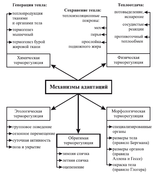 Физиолого-биохимические механизмы. Основой этих механизмов является гомеостаз внутренней среды организма. В ответ на возмущения во внутренней среде, пришедшие из среды внешней, нервной или нервно-гуморальной системой запускаются разные механизмы. Терморегуляцию гомойотермного животного отражает схема (рис. 11). У гомойотермных животных в ответ на снижение температуры окружающей среды происходит, например, рефлекторное усиление теплопродукции. Оно достигается путем выделения тепла функционирующими органами, тканями (химическая терморегуляция) и специфическим терморегуляторным теплообразованием (сократительный термогенез). Сократительный термогенез протекает в скелетной мускулатуре, не затрагивая ее прямую моторную деятельность, а также в покоящейся мышце. У млекопитающих одной из форм термогенеза является также окисление особой бурой жировой ткани, содержащей большое количество митохондрий и пронизанной многочисленными кровеносными сосудами. Под действием холода увеличивается кровоснабжение бурого жира, интенсифицируется его дыхание, возрастает выделение тепла, от которого нагреваются в первую очередь вблизи расположенные сердце, крупные сосуды, лимфатические узлы, а также центральная нервная система.