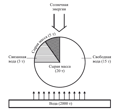 Регуляторные реакции при перегреве организма представлены также различными механизмами усиления теплоотдачи во внешнюю среду и отмечаются при первых признаках начинающегося перегрева. Ими являются интенсификация испарения влаги с поверхности тела, верхних дыхательных путей, потовыделение. У растений защитой от перегревания служит процесс транспирации, который из-за большого расхода воды называют «неизбежным злом». При потреблении 2000 т воды усвоенная и трансформированная вода составляет всего 3 т (0,15 %) (рис. 12). Уменьшение потерь воды при транспирации достигается разными приспособлениями. Сложными физиологическими процессами (кислотный метаболизм толстянковых, С4-фотосинтетический метаболизм) обеспечивается возможность жизни ряда растений в аридных условиях, а у С4-растений, кроме того, достигается очень высокая продуктивность в самых экстремальных условиях Земли, в «зонах экстраинсоляции» (пустыни Аравийская, Каракумы, Гоби, Сахара и др.).