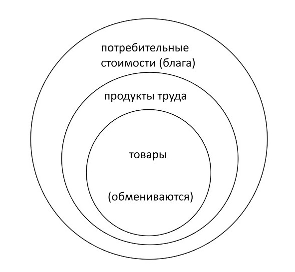 Имеем последовательное сужение объёма понятия: от блага вообще – к благу, являющемуся продуктом труда, и от продукта труда – к продукту труда, участвующему в обмене.