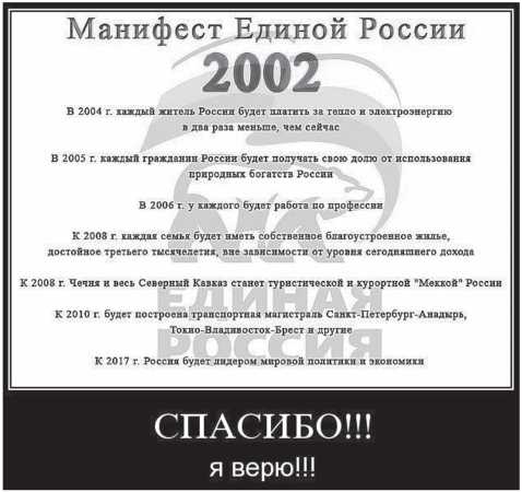 «Единороссы» обманули все ожидания народа и не выполнили ни одного обещания, данного через год после образования своей партии и на протяжении 15-ти лет её существования на вершине власти. Кстати, чтобы никто не вспомнил про их начальное враньё, они на всякий случай удалили эту предвыборную программу тех лет со своего сайта, лишний раз подтвердив свою мошенническую сущность.