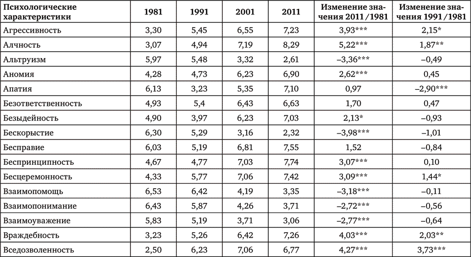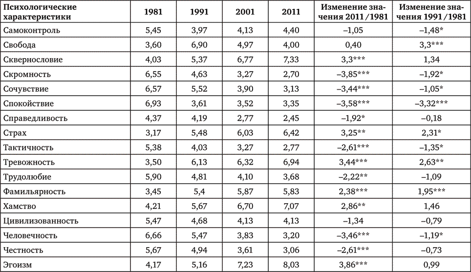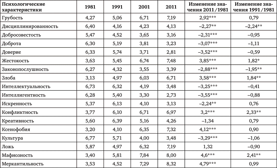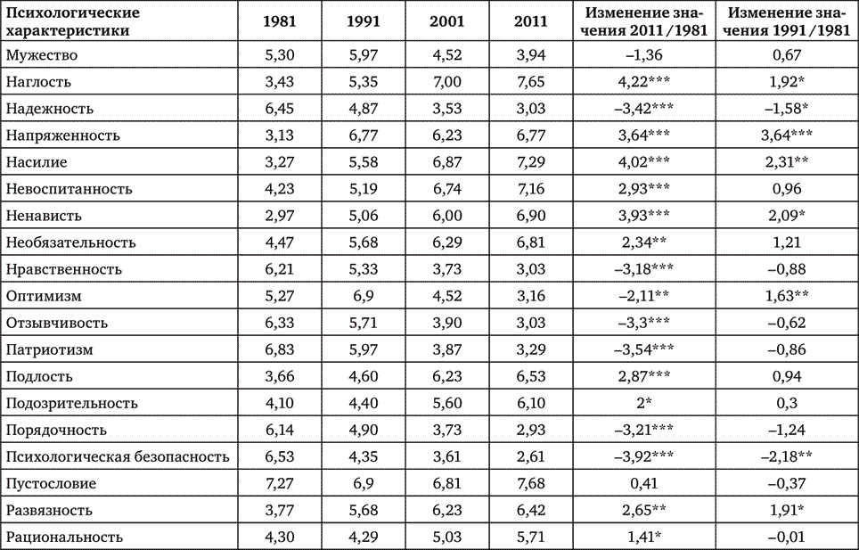 Таблица 5. Оценка экспертами психологических характеристик российского общества в 1981–2011 гг.
