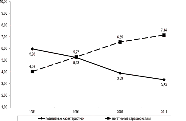 Даже с учетом сделанных оговорок полученные результаты (см. таблицу 5, рисунок 7) выглядят достаточно неожиданно. Если сравнить состояние нашего общества в двух крайних точках рассмотренного временного континуума – в 1981 и в 2011 гг., то следовать констатировать, что произошли нарастание всех без исключения негативных параметров и снижение подавляющего большинства позитивных. Лишь два позитивных параметра увеличили свои значения – рационализм и свобода, но и в этих случаях позитивная динамика не выглядит достаточно однозначной. Рационализм, видимо, был истолкован частью респондентов не как позитивная, а скорее как негативная характеристика общества, выражающая его алчность, меркантильность и т. п., а показатель уровня свободы обнаружил небольшой прирост (0,4) на рассмотренном интервале за счет его скачкообразного роста в 1991 г. (с 3,6 до 6,9) при последующем снижении.