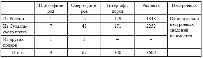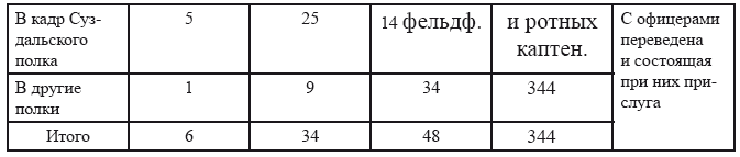 Из этой таблицы видно, что во вновь укомплектованном Тенгинском полку состояло 72,5 % офицеров Суздальского, 23, 6 % Тенгинского и 3,9 % других полков; строевых нижних чинов: Тенгинского 37,9 %, Суздальского 62,19 №.