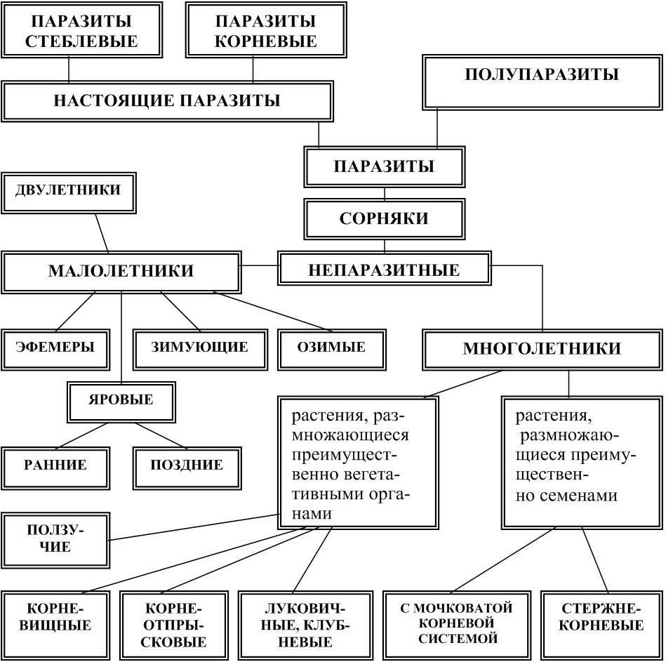 На территории Российской Федерации встречаются более 1500 видов широко распространенных сорных растений, что вызвало необходимость объединения их по важным признакам в группы. Наиболее удобной классификацией сорняков является биологическая, в основу которой положены способ питания, способ размножения и продолжительность жизни (рис. 1).
